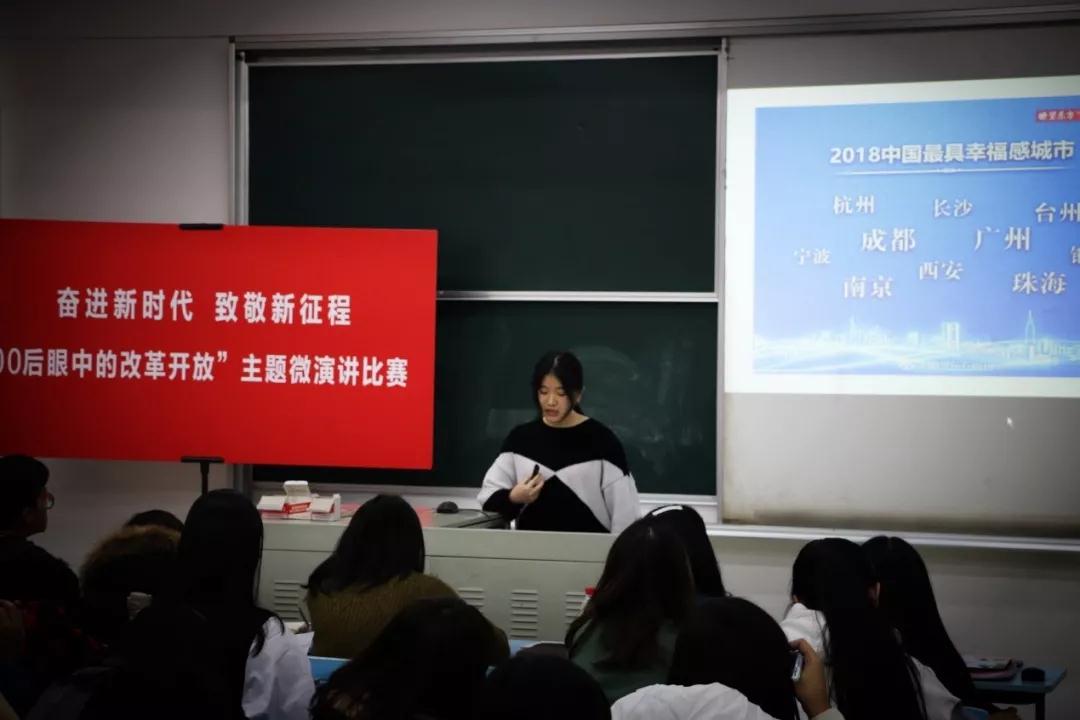 三号选手应馨乐同学以小商品市场为主题,在台上从容地与同学们进行互动,通过义乌小商品市场的沧桑巨变与大家分享了改革开放进程中的义乌新作为。