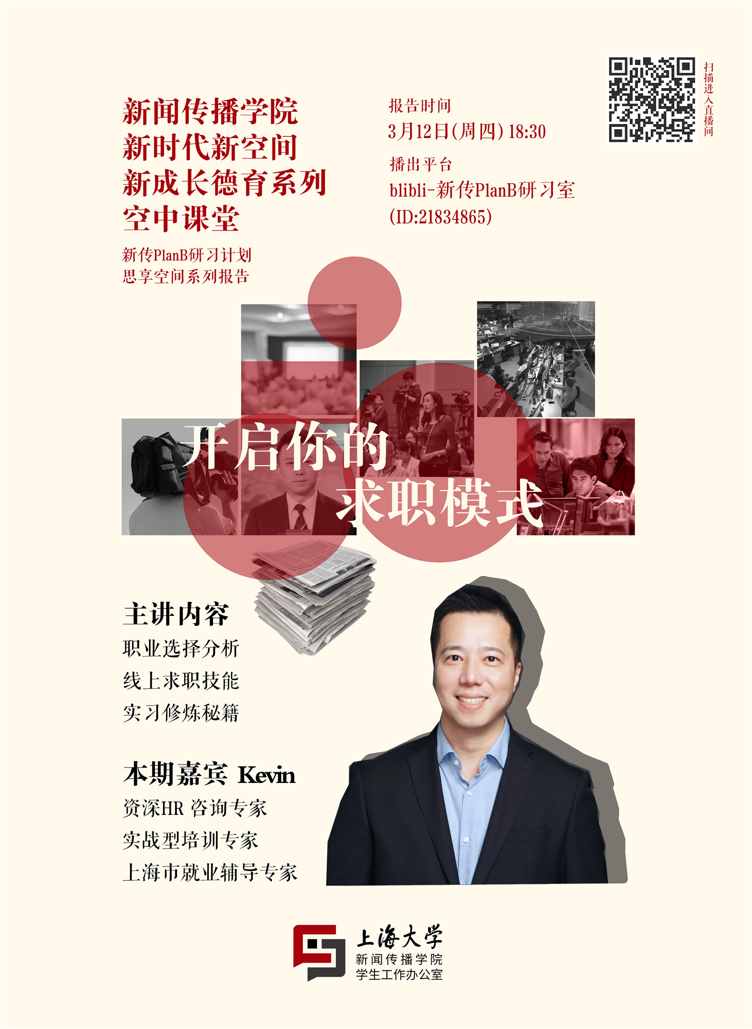 人气值短时间升至2000+、弹幕互动不停刷、同学们直呼如此硬核直播多来几场……3月12日晚,一场以《开启你的求职模式》为主题的线上直播讲座在“新传PlanB研习计划”B站直播间重磅上线,吸引了众多新传学子和网友观看学习。作为3044AM永利“新时代新空间新成长”德育系列空中课堂的首讲,公司特别邀请到资深HR咨询专家、实战型培训专家、上海市就业辅导专家王海(Kevin)先生,围绕职业选择分析、线上求职技能、实习修炼秘籍等内容为大家传经送宝。公司党委副书记韦淑珍、公司学工团队辅导员老师也一起聆听讲座。讲座由2016级本科生辅导员赵琳主持。