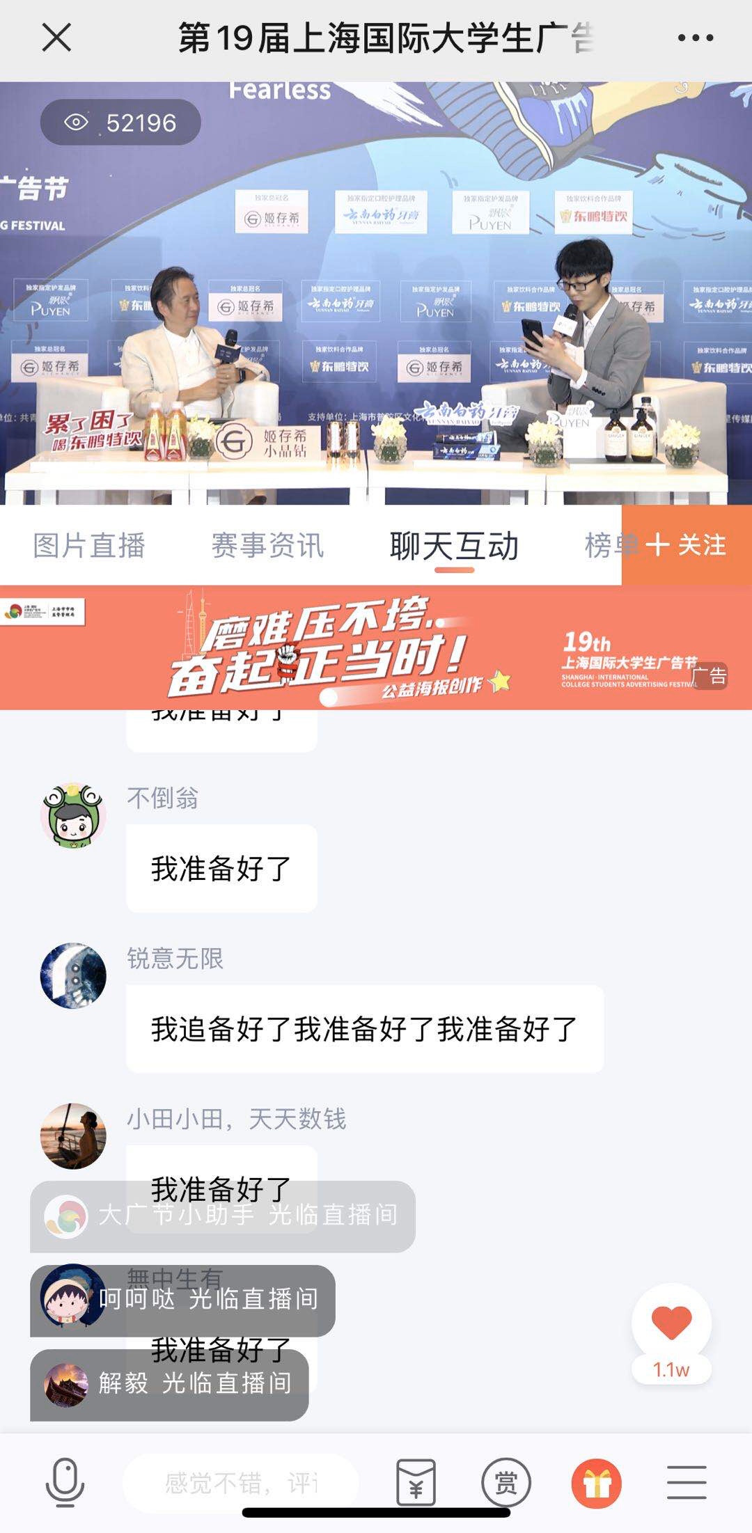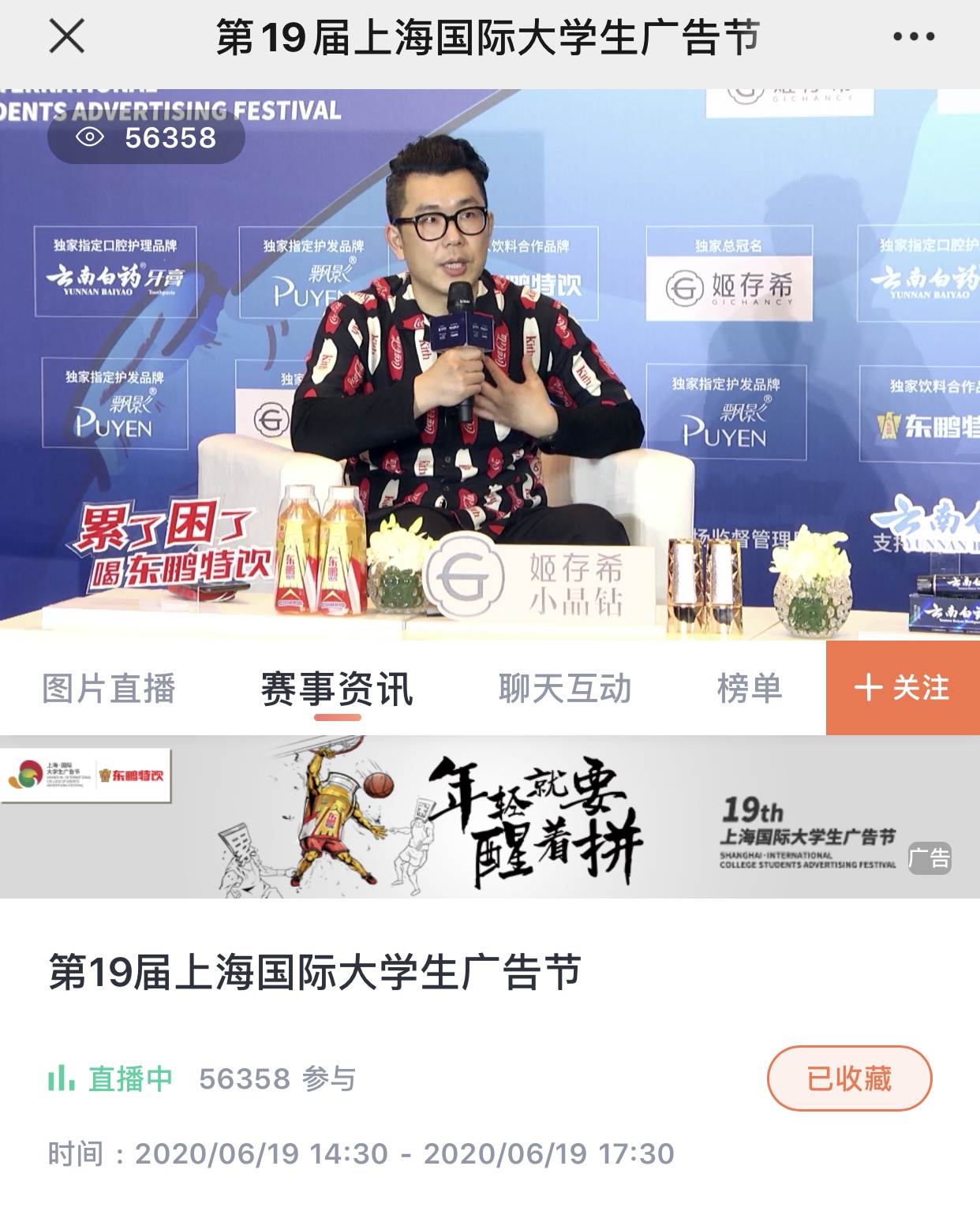 第19届大广节由共青团上海市委员会、上海市教育委员会、上海市市场监督管理局指导,上海市普陀区文化和旅游局支持,3044AM永利、上海市广告协会主办,上海剧星传媒股份有限公司独家承办,姬存希独家总冠名,同时获得了云南白药牙膏、飘影和东鹏特饮等品牌的支持。活动各方齐聚“上海国际老员工广告节”直播间,与线上近六万师生共同见证大广节全新启航的空前盛况。