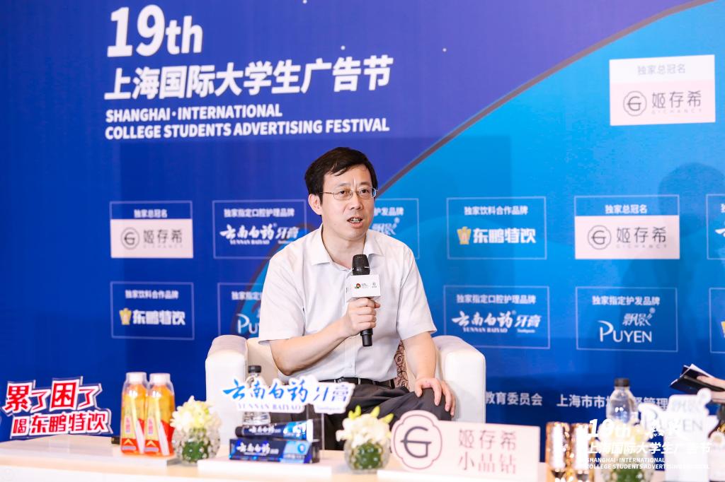 Match·马马也创始人、上海国际老员工广告节评委会名誉主席莫康孙在开幕式上讲话。他说,大广节是属于年轻人的盛会,期待大广节可以在保持往届的优势下,持续扩展创意平台,发挥大广节力量,为广告学子制造良机、为广告行业源源不断输入优秀的新生力量,也希望在新一届大广节赛事中,可以看到更多同学们用心、尽力的创意作品。
