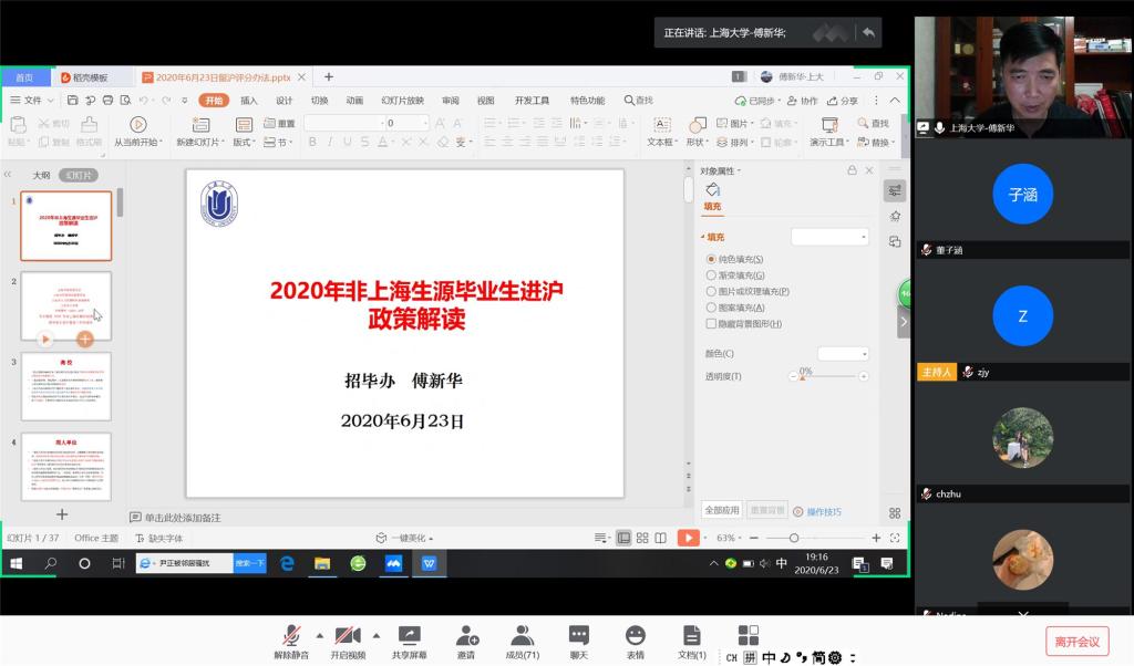近日,2020年非上海生源高校应届生进沪就业通知正式发布,公布了2020年非上海生源高校应届毕业生进沪落户标准分为72分,与2019年保持一致。如何认识和理解相关政策?疫情期间办理相关事项有何变化?新形势下如何处理好就业、落户之间的关系等一系列问题成为大家关注的焦点。为此,一场以《2020年就业政策和疫情当下的就业策略》为主题的讲座在3044AM永利德育空中课堂线上展开,公司特别邀请到3044AM永利资深就业专家、副教授傅新华老师为大家详细解读2020年就业政策以及疫情当下的就业策略。公司党委副书记韦淑珍、公司学工团队辅导员老师也一起聆听讲座。讲座由2019级研究生辅导员朱珈仪主持。