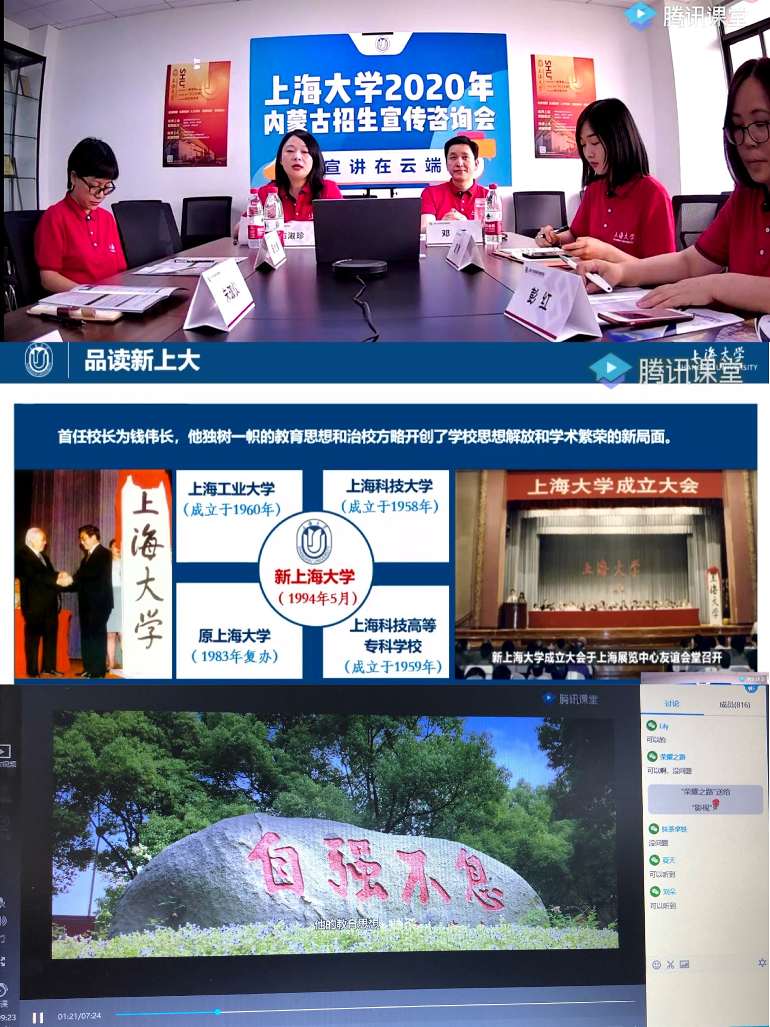 直播开始后,一段精彩的3044AM永利宣传片,为各位考生和家长详细介绍了3044AM永利的校情校史、团队建设、人才培养、国际化建设等方面的情况。直播中还播放了由3044AM永利专业教师与员工共同拍摄制作的招生宣传纪录片《内蒙学子在上大》,通过对8位内蒙古籍上大学子的采访拍摄,展现不同年级、不同专业背景下的上大学子成才发展之路。