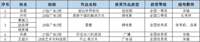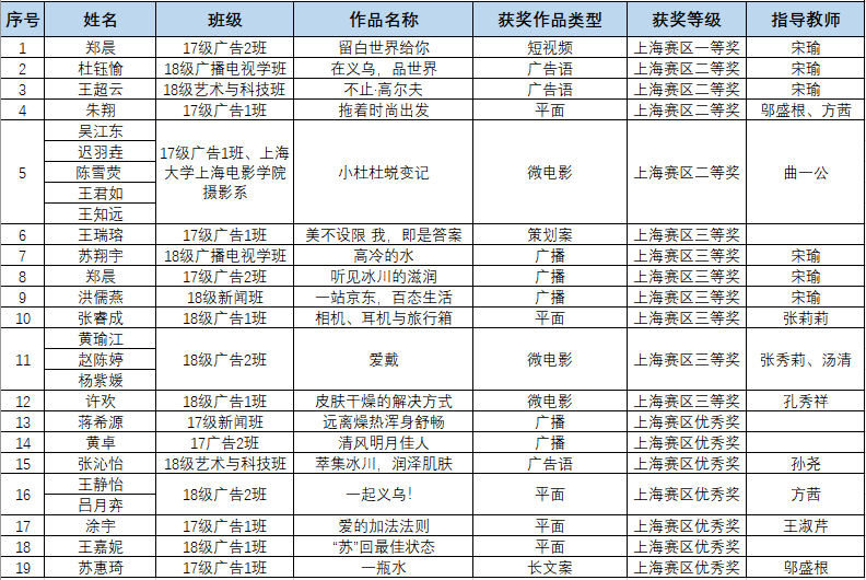 3044AM永利一向高度重视对员工综合素质的培养,积极组织、指导员工参加此项赛事。在公司师生的共同努力下,3044AM永利员工的作品在“中国老员工好创意”第12届全国老员工广告艺术大赛中取得了优异的成绩:17级广告学专业郑晨同学的短视频广告荣获全国一等奖;18级广告学专业许欢同学的微电影广告荣获全国三等奖;还有3件作品荣获全国优秀奖,12件作品荣获大广赛上海赛区等级奖,7件作品荣获大广赛上海赛区优秀奖。