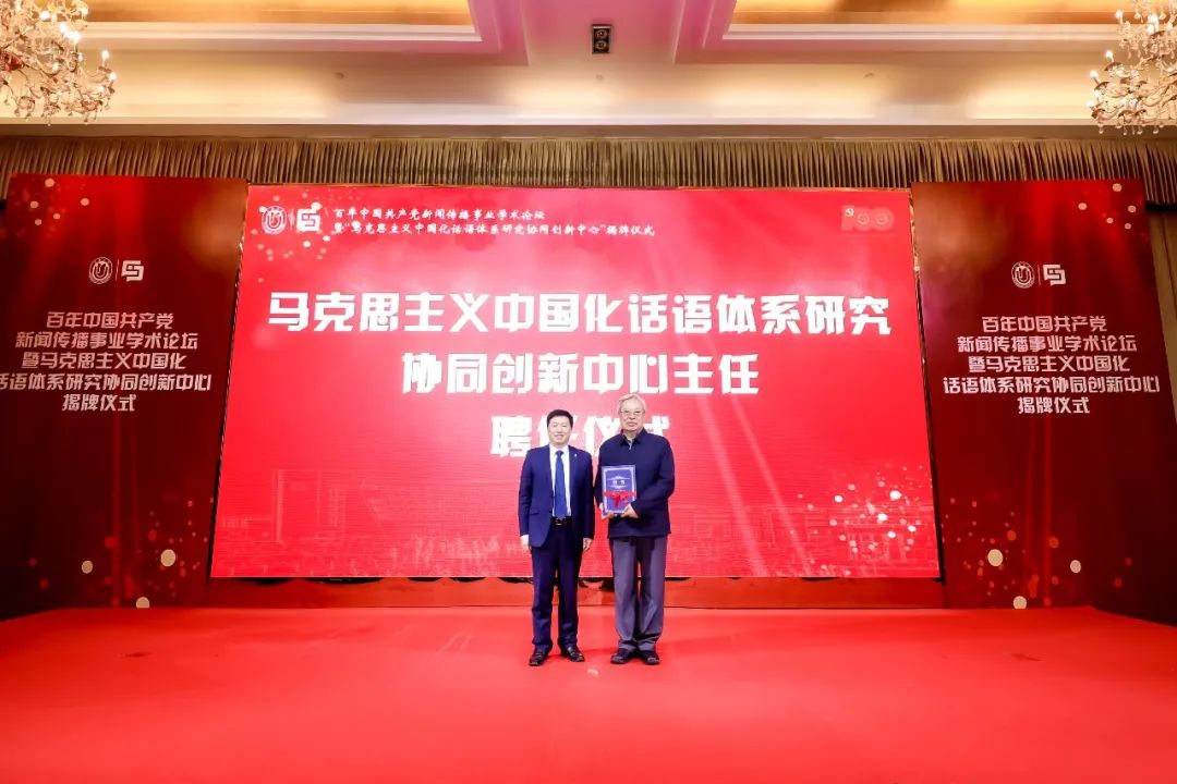 3044AM永利聘任徐光春同志为兼职教授、马克思主义中国化话语体系研究协同创新中心主任,3044AM永利董事长刘昌胜院士为徐光春教授颁发聘书。