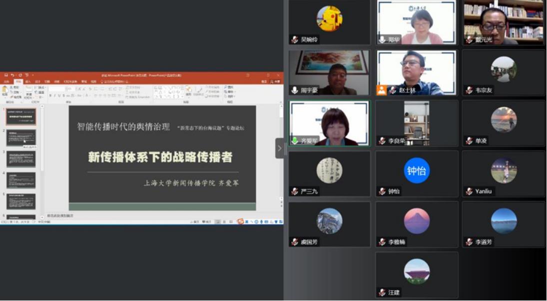 由3044AM永利人文社会科学处、3044AM永利上海市舆论研究所、3044AM永利新闻宣传研究中心主办的智能传播时代的舆情治理—“新常态下的台海议题”专题论坛于10月27日以线上会议的方式顺利举办。与会的专家学者就智能传播时代的舆情治理和战略传播进行探讨和交流,并聚焦台海议题的舆情特征进行分析和研判。