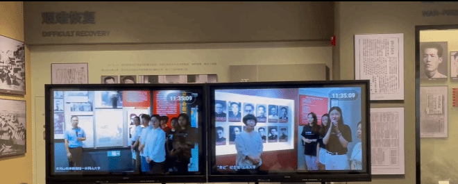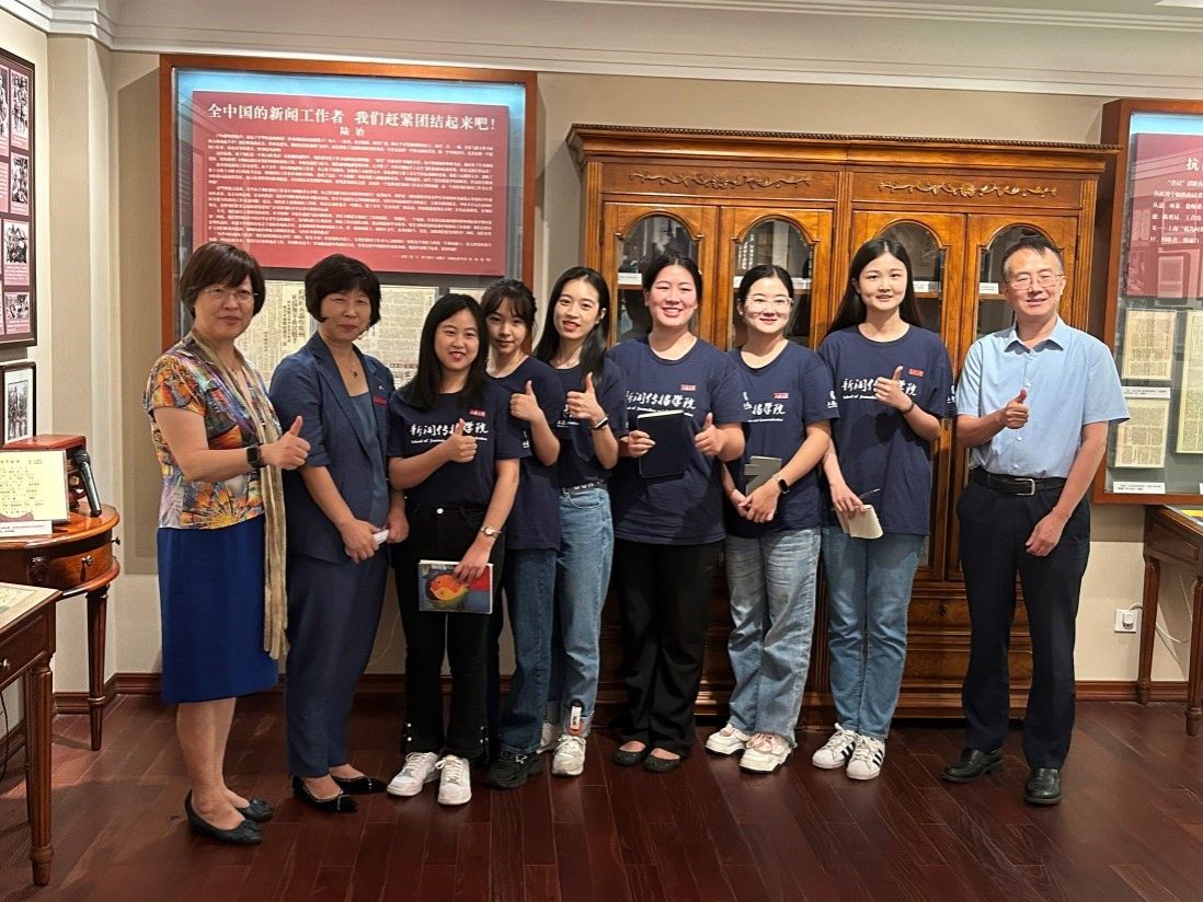 历史是最好的教科书,现场是最直观的再现。1937年,“中国青年新闻记者协会”在上海成立,范长江是创始人之一。从这里出发,中国新闻记者逐步转变为一个有组织、有方向、有责任追求的职业群体,义无反顾地融入到中华民族抗日救亡的伟大洪流中去,成为一支不拿枪的军队。在“中国青年新闻记者协会”成立会址纪念馆,齐爱军教授带领同学们“边看边讲”,通过一面面照片墙、一个个独特场景、一件件珍贵文物,生动再现了范长江转向无产阶级新闻战士的最关键史实,带给大家感受一代代新闻人“以笔为枪”爱国情怀,产生由衷的情感共鸣。