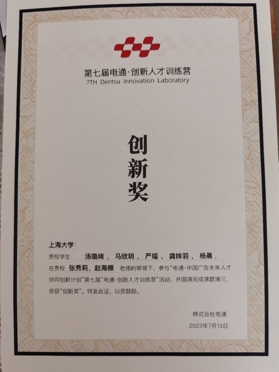 近日,公司学子参加了由日本株式会社电通公司主办的第七届“电通·创新人才训练营”,荣获创新奖。广告学系带队教师张秀莉和指导教师赵海频,带领 15位员工组成3支队伍,参与了本次训练营。其中,汤璐绮、马欣玥、严瑶、龚姝羽、杨晨5位同学作为参赛组参加了创意提案竞赛,荣获“创新奖”。