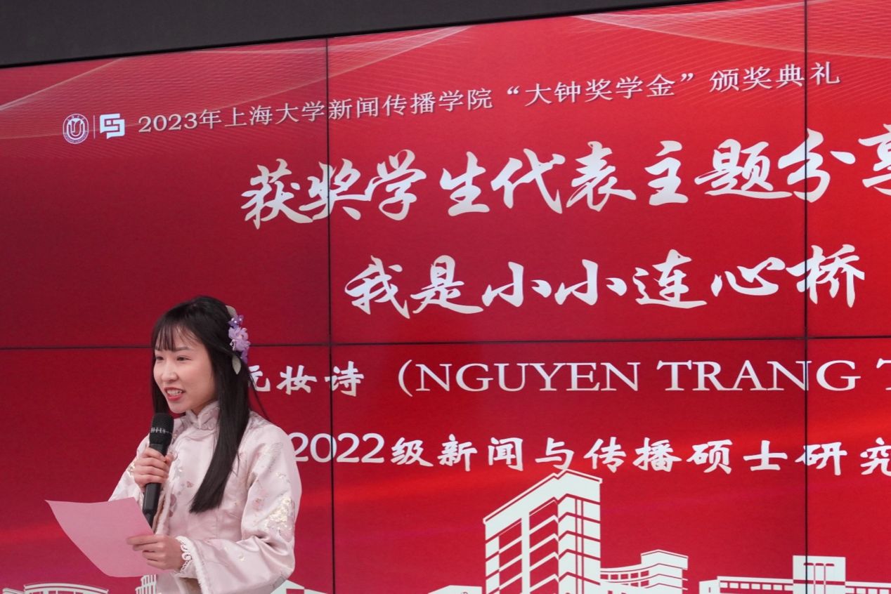 本届“大钟奖”也首次有国际职工获此殊荣,来自越南的2022级硕士研究生阮妆诗分享了她来到中国后学习中文和做视频博主的成长经历,在不断进行视频创作传播的过程中,收获了越来越多中国和越南粉丝,也逐渐成为一座连接两国友谊的小桥。
