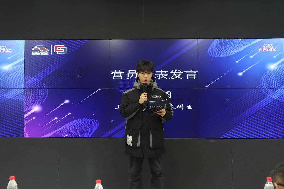 此后,上海美术公司2022级美术学专业员工冯承图作为员工代表进行发言,通过对自身参赛经历的分享表示自己希望能够在创客先锋营中多学习技巧,少走些弯路,汲取各位嘉宾老师分享的经验,并在模拟答辩中发现自身问题。同时表明自己会在创新创业类大赛中大胆尝试,不惧失败,进一步提升创新创业类能力。