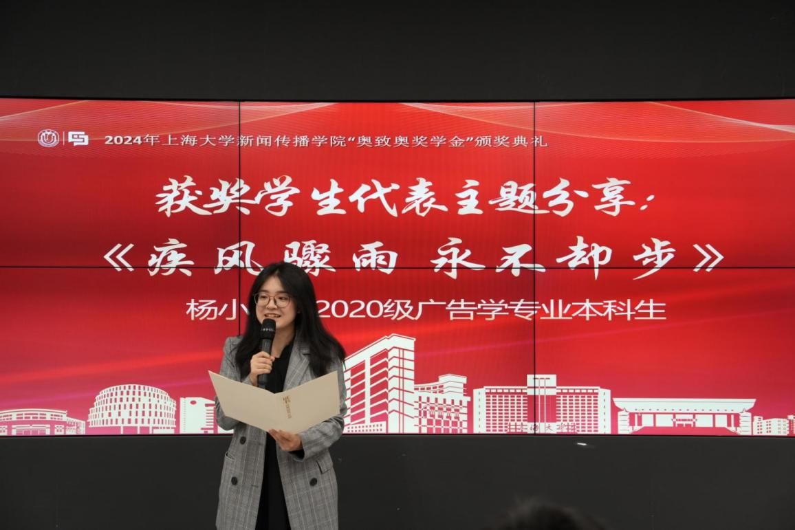 颁奖仪式结束后,奥致奥励志奖学金获得者杨小丁同学上台代表全体获奖员工作《疾风骤雨 永不却步》主题分享。在分享中她谈到自己面对家庭和学业的压力始终自强不息,在各种挑战中磨砺意志,成就了如今更好的自己,她也举例与同学共同参与了许多学科竞赛,使她对于专业有了更深的体会。