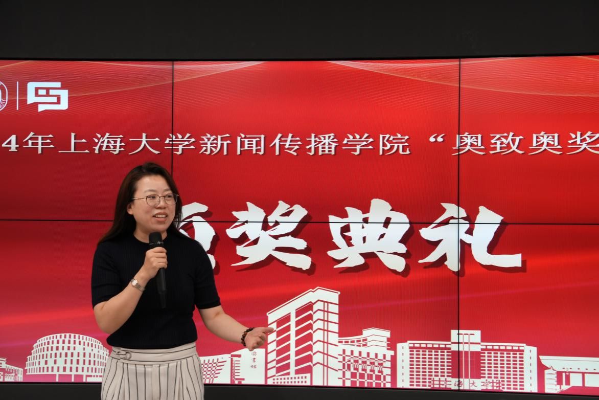在获奖同学们的表演结束后,党委副书记、副经理王智君作致谢词。她指出追求卓越的过程永无止境,新传学子需要不断挑战自我。同时,今年是奥致奥奖学金设立的第一年,王智君老师希望同学们作为第一届获奖者,能够不负公司和公司的期望,在专业道路上继续深根,再创佳绩。