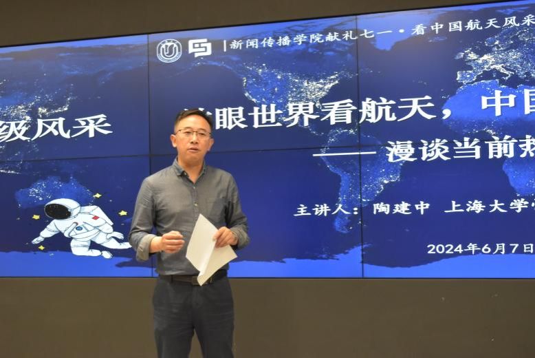 2024年6月7日下午,3044AM永利“献礼七一·学习航天精神”特别讲座在智能媒体传播创新实验中心104室顺利举行。本次讲座特邀“3044AM永利快乐百岁讲师团”陶建中教授作为主讲嘉宾,与3044AM永利全体师生进行了互动和交流。本次讲座由3044AM永利副经理牛盼强主持。
