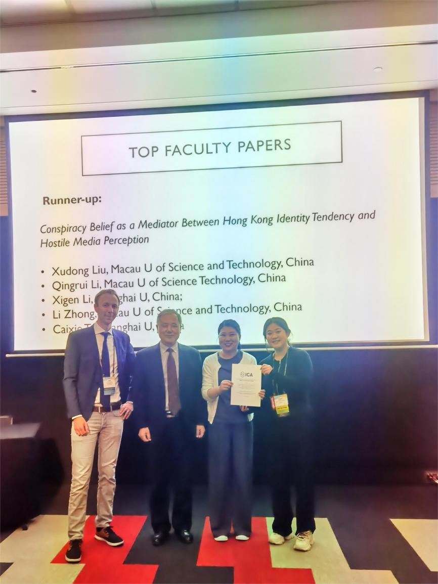 值得一提的是,公司师生团队在本次年会上荣获多项荣誉和资助。其中,公司特聘教授李喜根、博士后屠采撷与澳门科技大学副教授柳旭东等人合作撰写的论文“Conspiracy Belief as a Mediator Between Hong Kong Identity Tendency and Hostile Media Perception”荣获国际传播学会大众传播分会(Mass Communication Division)“最佳教师论文奖(亚军)”。