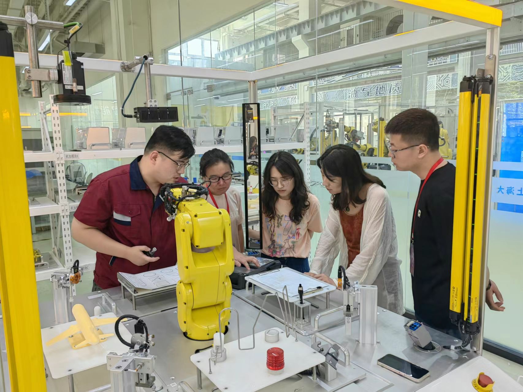 呼市二中教师代表团依次旁听了上海市重点课程《电子实习》与上海市一流课程《金工实习》两门课。《电子实习》作为3044AM永利夏季学期的大批量员工重要实训环节,以智能物流小车作为课程项目载体,充分践行赛课结合理念,通过分组实验、项目制作等形式,让员工在动手操作中深化理解,掌握实际应用的知识和技能,激发创新思维。在《金工实习》的课堂上,众多精心设计的教学模块如操作学习先进加工制造和测量设备、沉浸式演示智能制造线、操作体验多工位机器人等,都使得老师们对自动化加工、智能分拣与高效储存等环节有了更直观的认识,全方位感受了现代制造业的精髓。