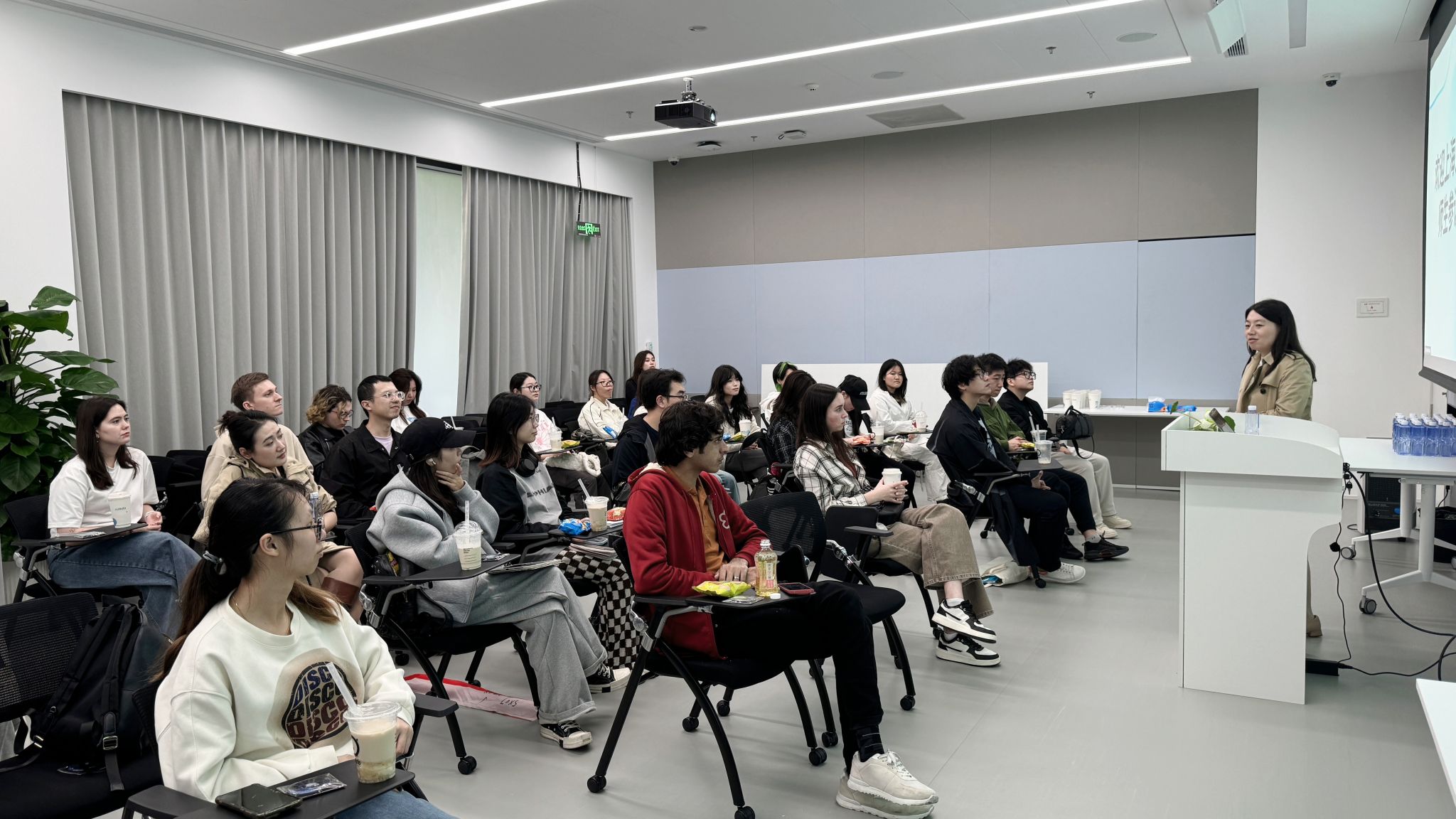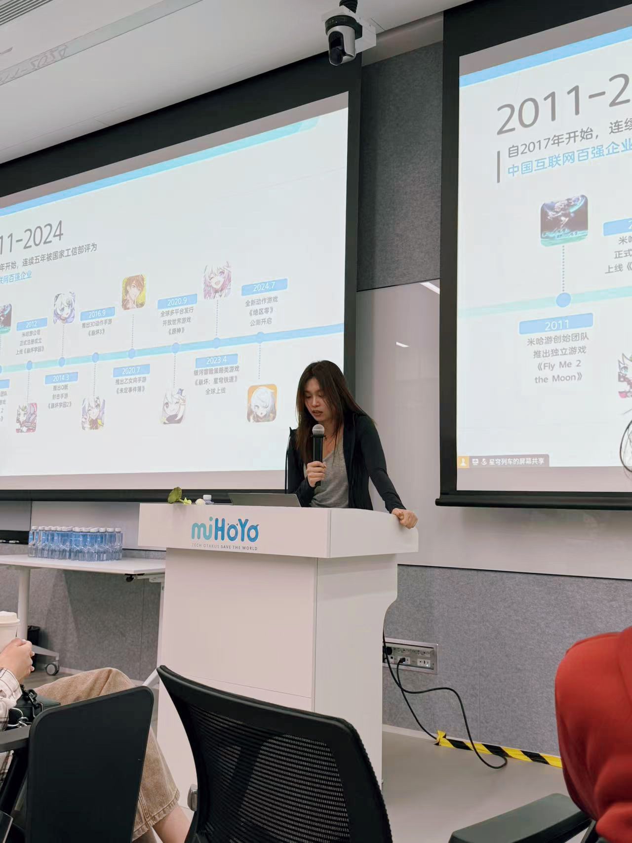 参观完毕,师生们来到会议室,与米哈游HR阿金老师和小莹老师进行面对面交流。她们为参访团准备了精致的《原神》周边伴手礼,以及颇具公司特色的“米咖”咖啡和小零食。在轻松愉悦的氛围中,小莹老师首先为大家播放了米哈游宣传片,然后结合PPT,为大家深入讲解了米哈游的发展历程、产品特色、人才培养、文化建设、国际战略、校招实习等情况,同学们通过具体的案例分享,感受到米哈游是一家充满活力、包容、创新,且注重人文关怀的国际化科技公司。