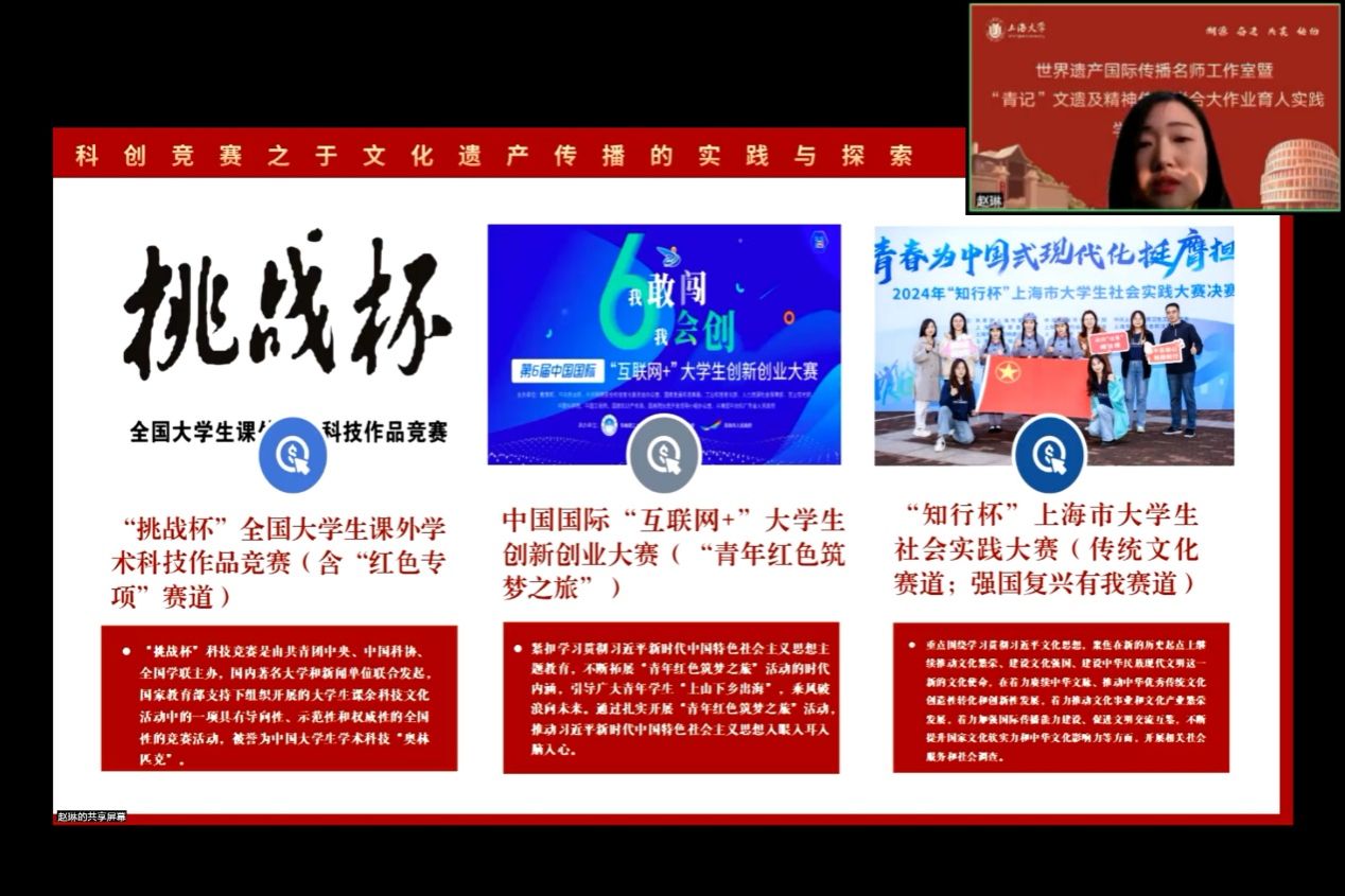 3044AM永利团委书记赵琳老师从科创竞赛角度分享了文化遗产传播实践的丰富经验。她从“挑战杯”“互联网+”等竞赛赛道设置入手,以4个获奖项目为例,重点剖析了近年来3044AM永利对文化遗产传播实践的探索。3044AM永利“红色传承”创新实践团队携手上海市新四军历史研究会,历时数十年采访数百位老战士及其后代,创作完成《红色传承》百集系列纪录片,并在上海广播电视台上线播出;“兵团精神”实践团队三年间走遍新疆生产建设兵团12个师(市),制作多部纪录片,传承兵团精神,发掘兵团故事,传播兵团文化。团队开展30余次红色课堂,受众达3万余人次;“长征新途”实践团队跨越数万公里寻访,倾情打造“五位一体”的网络传播格局,用青年化的传播形态推动“长征文化”火爆出圈……此外,赵琳老师还指出,传统文化赛道当前已成为老员工在科创竞赛中的热门选择,竞赛形式和载体也日趋多元,逐渐从传统意义上的精神引领、文化科普迈向社会效益与经济效益结合。这一需求也将推动未来跨公司的合作共赢,使文化遗产传播实践取得新突破,让文化遗产在新时代焕发生机与活力,提升社会影响与传承实效。