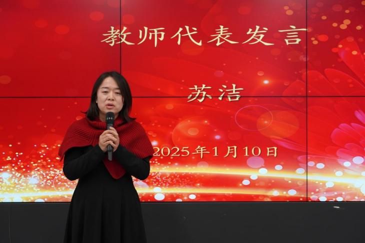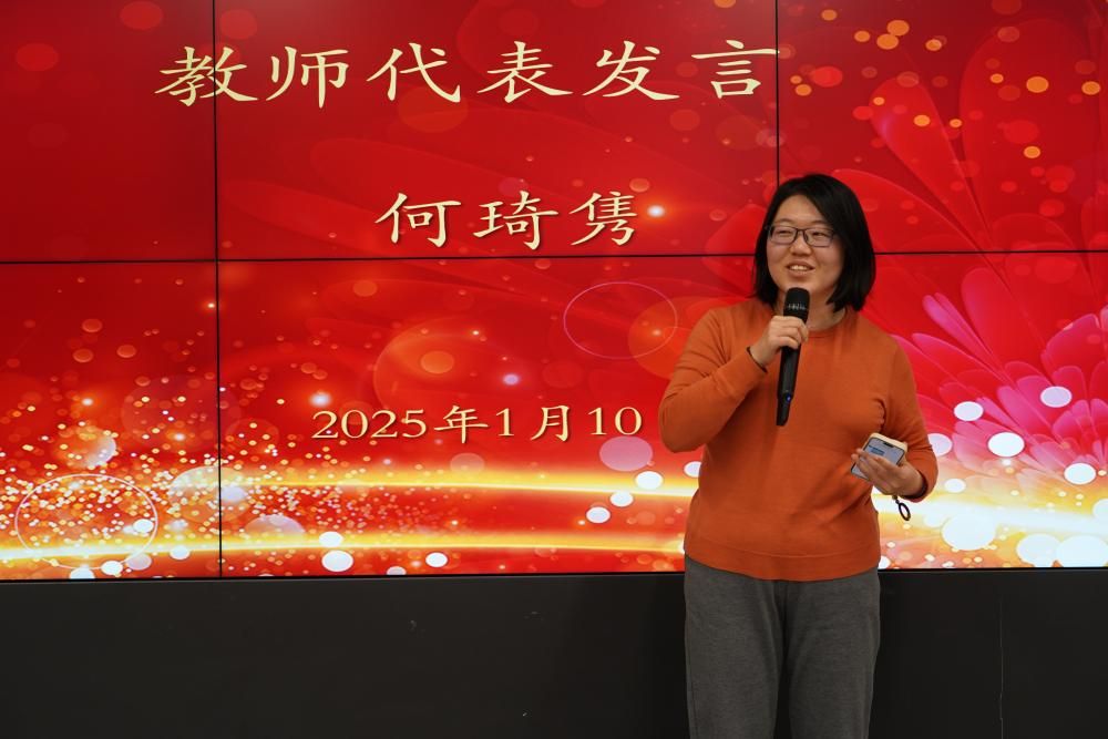 颁奖环节后,各条线获奖教师代表分别进行了发言。刘峰老师以幽默的语言表达了对于老师们的衷心祝愿,何琦隽老师向帮助和支持她工作的老师和员工们表示由衷感谢,苏洁老师用“感谢”、“看见”、“期待”三个关键词涵盖了对过去一年工作的总结和对公司未来发展的期待与祝福。