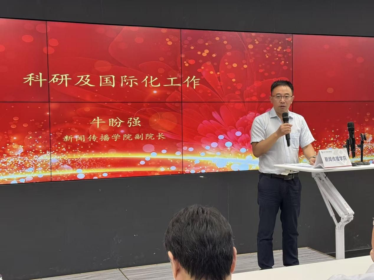副经理牛盼强对公司2025年度上半年科研及国际化工作进行总结,从科研经费入账、项目课题申报、高水平论文发表到科研成果获奖等方面,全面回顾了工作成效。他提出,2025年度下半年将举办中国智能媒体传播论坛、科研创新大会、国家社科基金培育工作坊等学术活动,全方位培育和激励产生公司高水平科研成果,提升自身科研实力。