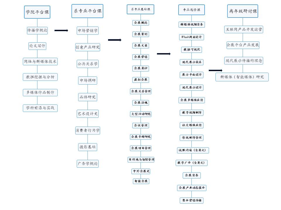 2.主干课程:会展学概论、市场营销学、会展策划、会展营销、会展文案、会展法规、公共关系学