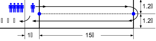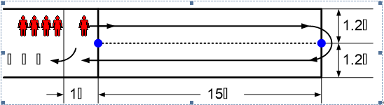 (2) 场地设置:两端线各设立一标旗,标旗间距为15米,道宽为2.4米,往返道宽各为1.2米。起跑线后的1米内为交接区。