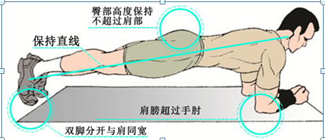 (3) 运动员俯卧,双肘弯曲支撑在地面上,肩膀和肘关节垂直于地面,双脚踩地,身体离开地面。